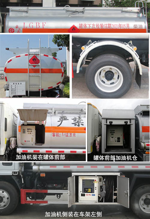 | 配置 | 1、該車適用于危險品運輸,運送危險貨物車輛類型為:FL型,類項號:3。運輸介質:柴油、煤油、汽油,密度:830、800、700千克/立方米,罐體有效容積4.5立方米,罐體外形尺寸(長×寬×高)(mm):①加油機側裝在車架左側:3800×1600×1000,②加油機裝在罐體前部:3800×1750×1220(加油機倉長800);③選裝罐體前加油機倉:3000×1750×1220。罐體上部選裝折疊護欄、選裝無上走道;選裝弧形擋泥板。2、側防護采用冷彎型鋼/Q235,螺栓連接。后防護采用冷彎型鋼/Q235,焊接,截面高100mm,截面寬50mm,下邊緣離地高450mm。加油機型號及生產企業:BL1111Z/珠海市貝林加油設備有限公司中山分公司,HS1812B/托肯恒山科技(廣州)有限公司,SKES-1112/恒和嘉華科技有限公司(上海伯萊機械有限公司),SK20QF-111A、SK20QF-222A/鄭州三金石油設備制造有限公司,CS20D1110F/正星科技有限公司,JSK-70B1121CZ,JSK-70B1121C,JSK45B1121C/穩恩佳力佳(北京)石油化工設備有限公司, ZH6444/佛山市眾澤機電科技有限公司, XTST121BF1/邢臺正潤通科技發展有限公司,TA-1111KFJ/沈陽航天新陽機電有限公司。3、隨底盤選裝前面罩,前保險杠,前組合燈具,選裝左右油箱位置。僅選用排氣管前置、限速裝置(限速80km/h)、前輪盤式制動及子午線輪胎的底盤,安裝帶有衛星定位功能的行駛記錄儀。ABS廠家及型號:襄陽東風隆誠機械有限責任公司/ABS/ASR-24V-4S/4M。轉向輪安裝輪胎爆胎應急防護裝置。 | ||