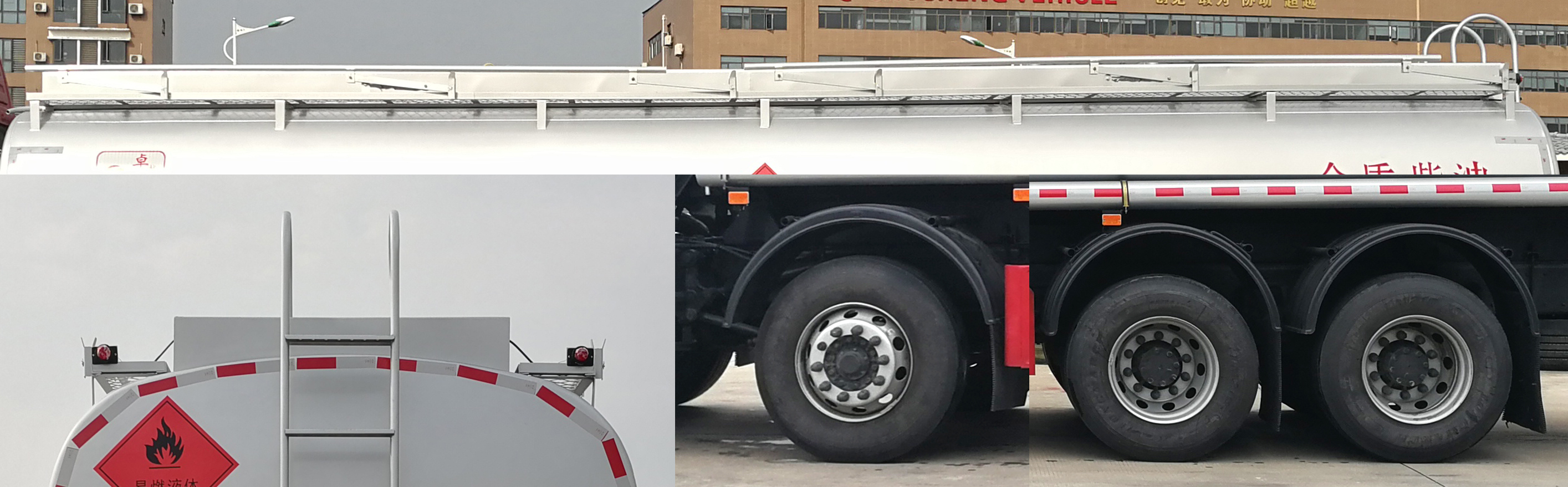 | 配置 | 該車為危險貨物運輸車,運送危險貨物車輛類型為:FL型,類項號:3。運輸介質:汽油,罐體有效容積27.5立方米,罐體外形尺寸(長×寬×高)(mm):8900×2300×1660。僅選用軸距(mm):1800+4575+1400。側、后防護材料均為Q235,螺栓連接,后防護截面尺寸(mm)80×140,下邊緣離地高460mm。隨底盤選裝駕駛室。僅選用排氣管前置、限速裝置(限速80km/h)、前輪盤式制動及子午線輪胎的底盤。轉向輪安裝輪胎爆胎應急防護裝置。后軸采用空氣懸架。安裝帶有衛星定位功能的行駛記錄儀。EBS**系統型號/生產廠家:EBS3/威伯科(上海)管理有限公司。發動機/油耗值(L/100km)對應關系為:MC07.31-60/38.0,MC07.34-60/38.0,MC09.35-60/38.2,MC09.38-60/38.2,MC09.35B-60/38.2,MC07.33-60/38.0,MC07H.33-60/37.44,MC07H.35-60/37.44,MC11.40-60/37.3,MC11.44-60/37.3,MC11.40-61/37.3,MC11.43-61/37.3,WP8.350E61/38.04。選裝ETC。罐體上部選裝上走道,**軸及驅動軸選裝弧形擋泥板。 | ||