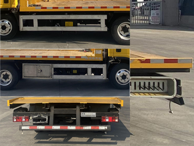 其它:該車主要用于道路清障,主要專用裝置為平板、絞盤、鋼絲繩、油缸。該車無托舉功能。側防護材料為鋁合金,螺栓連接;后防護材料為Q235,焊接,截面尺寸100×50mm,離地高度460mm。ABS型號/廠家:VIE ABS-II/浙江萬安科技股份有限公司。