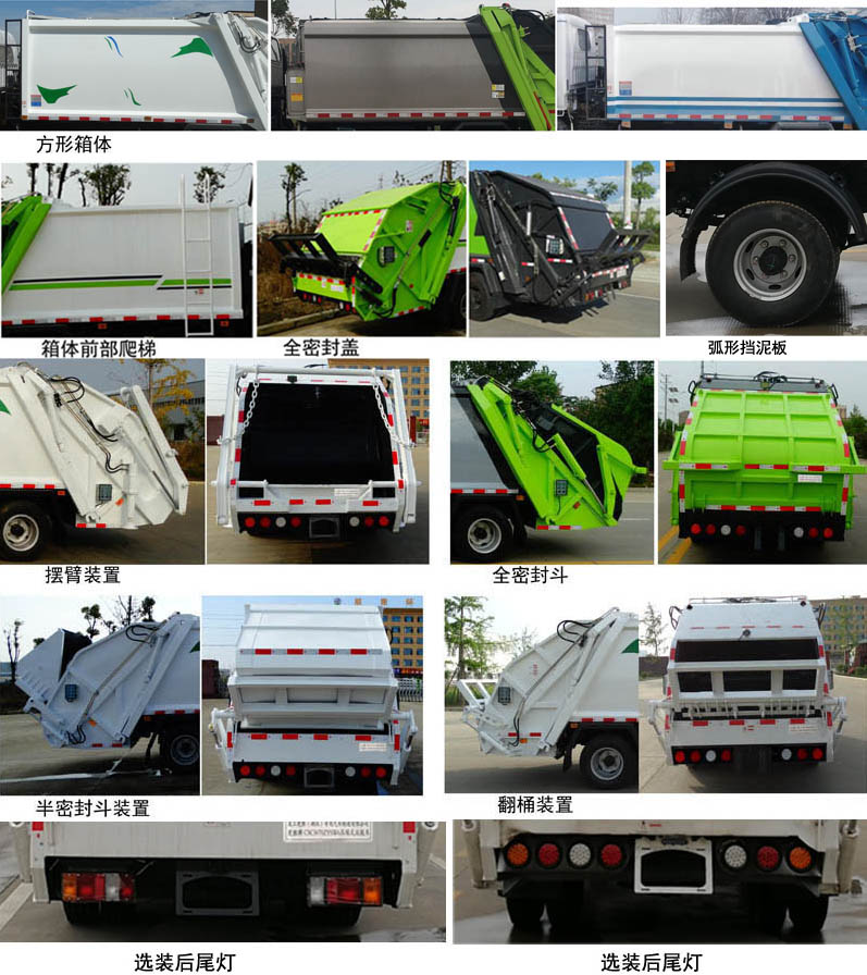 配置  1、該車主要專用裝置由箱體、壓縮系統組成,用于垃圾的收集與清運。該車可選裝方形或弧形箱體,選裝全密封蓋裝置,選裝弧形擋泥板,選裝箱體前部爬梯,選裝后部工作裝置。選裝工作裝置時,外形長(mm)/后伸(mm)/整備質量(kg)對應關系:①無上料裝置: 6465/-/5280;②擺臂裝置: 6625/160/5600;③全密封斗裝置: 6665/200/5600;④翻桶裝置,半密封斗裝置: 6865/400/5600。2、側防護采用冷彎型鋼/Q235,螺栓連接;后防護由專用裝置替代,下邊緣離地高500mm。3、隨底盤選裝一種僅變化前面板、前格柵、前組合燈具的駕駛室;選裝后視鏡款式;選裝前部標牌“4K ENGING/NJR/NHR/NKR/100P”。ABS型號/生產企業對應關系為:APG3550500A/浙江亞太機電股份有限公司,CM4YL/廣州瑞立科密汽車電子股份有限公司;CM4XL-4S/4M/廣州瑞立科密汽車電子股份有限公司;4、發動機4KH1CN6LB的油耗值為15.9L/100Km。