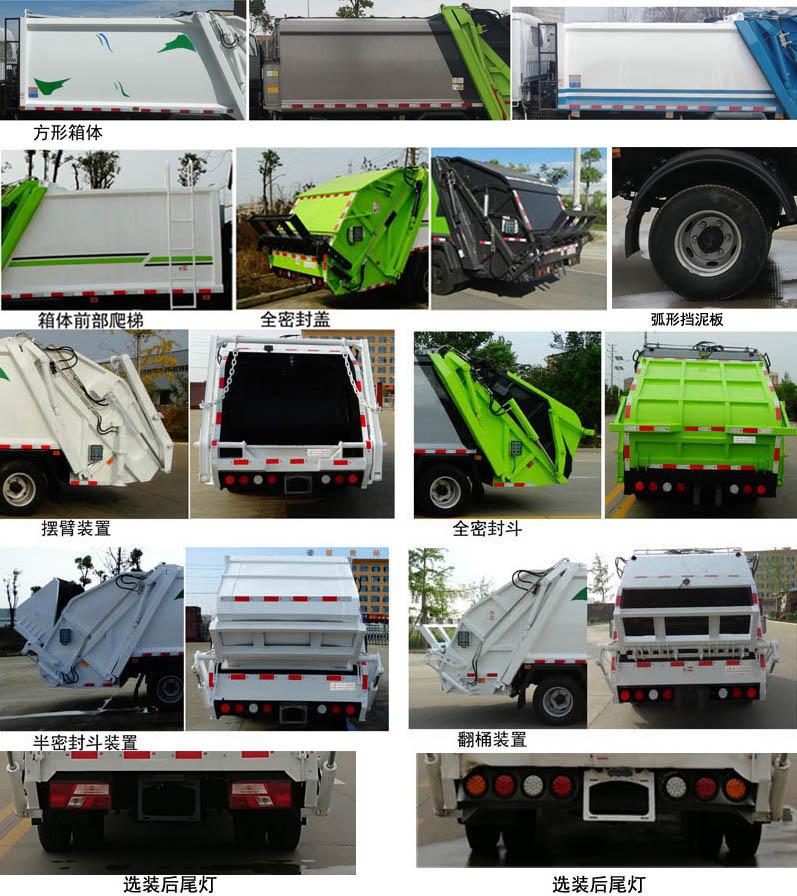 配置  1、該車主要專用裝置由箱體、壓縮系統組成,用于垃圾的收集與清運。該車可選裝方形或弧形箱體,選裝全密封蓋裝置,選裝弧形擋泥板,選裝箱體前部爬梯,選裝后部工作裝置。選裝工作裝置時,外形長(mm)/后伸(mm)/整備質量(kg)對應關系:①無上料裝置: 6570/-/5830;②擺臂裝置: 6730/160/6100;③全密封斗裝置: 6770/200/6100;④翻桶裝置,半密封斗裝置:6970/400/6100。2、側防護采用冷彎型鋼/Q235,螺栓連接;后防護由專用裝置替代,下邊緣離地高500mm。3、隨底盤選裝黑色輪輞。ABS系統型號: VIE ABS-II,ABS系統生產廠家: 浙江萬安科技股份有限公司。發動機JX4D306H的油耗值為14.5L/100km。